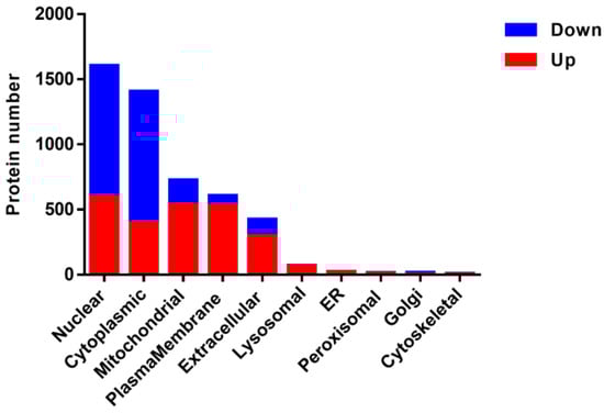 Subcellular annotation of the DEPs in PAMs infected with PRRSV-ADE infection. Upregulated proteins are shown in red, and downregulated proteins are shown in blue.