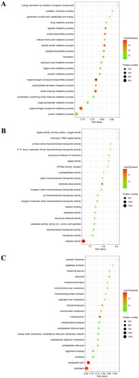 GO enrichment analysis of the DEPs in PAMs with PRRSV-ADE infection for biological process (A), molecular function (B) and cellular component (C). The abscissa in the figure is the rich factor which is the ratio of the number of different proteins in the corresponding pathway to the total number of proteins identified by the pathway. The color of the dot represents the p value of the hypergeometric test. The color ranges from green to red. The redder the color is, the smaller the value is. The size of the point represents the number of differential proteins in the corresponding pathway.