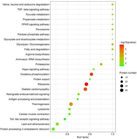 KEGG enrichment analysis of the DEPs in PAMs with PRRSV-ADE infection. Rich factor refers to the ratio of DEPs annotated in this pathway to all identified protein numbers annotated in this pathway. A larger rich factor with a lesser p value indicates a greater intensiveness. The top 26 enriched pathway terms were revealed.