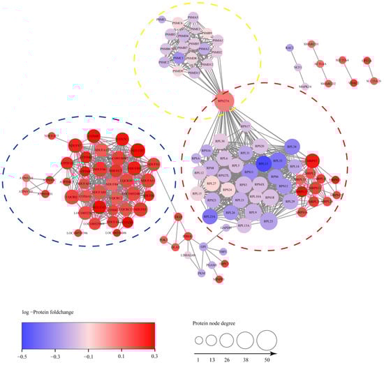 The PPI network of 143 DEPs. The connections between proteins indicate that they interact with each other and the confidence interval is greater than 0.9. DEPs were mainly concentrated in three PPI network clusters including ribosome, proteasome and mitochondria, which were circled with red, yellow and blue, respectively.