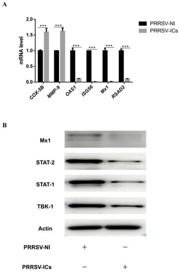 The validation of the DEPs in PAMs with PRRSV-ADE infection. (A) RT-qPCR analysis of six selected DEPs (COX-5B, MMP-9, ISG56, OAS1, Mx1 and RSAD2) in PAMs with PRRSV-ADE infection. (B) Western blot analysis of four DEPs (TBK-1, STAT-1, STAT-2 and Mx1) in PAMs with PRRSV-ADE infection. *** p < 0.001.