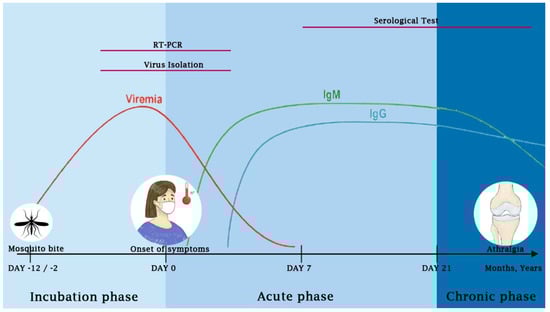 Laboratory examination of CHIKV infection can be performed using various methods, including viral isolation, serological methods, and RNA detection using real-time quantitative reverse transcriptase polymerase chain reaction (qRT-PCR) [155]. In the past, the diagnosis was mainly based on serological methods to detect the presence of specific antibodies against CHIKV. With the advance of molecular techniques, qRT-PCR is more commonly used to detect the presence of viral RNA, particularly in the acute phase of infection. Most importantly, the testing method should be carefully selected by considering the purpose of the examination and the timing of specimen collection [155]. Accordingly, the interpretation of laboratory findings should be based on the kinetics of viral replication (viremia) and antibody responses in humans (Figure 4).