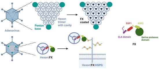 Physiological concentrations of FX in the blood plasma range from of 6 to 10 µg/mL [,]. It is a calcium- and vitamin K-dependent proenzyme of a serine protease containing epidermal growth factor 1 and 2 (EGF1 & 2), and a Gla (γ-carboxylated glutamic acid) domain []. Electron cryomicroscopy showed that the Gla domain of FX binds to the cavity of a hexon trimer on the Ad5 capsid [], resulting in 205 FX molecules bound per viral particle [], thus protecting the Ads from neutralization by human sera via IgM and classical complement pathway [,,]. The interaction between Ad5 and FX occurs between hypervariable loops 5 and 7 of the Ad hexon and a lysine residue from FX in the Gla domain. The serine protease domain of FX binds to the HSPG on the host cells [,]. A schematic overview of the bridging of FX between Ad5 capsid and HSPG is shown in Figure 1. Additionally, αv integrins are needed as secondary receptors for a successful uptake of Ad5:FX-complex via HSPG into the host cell [,].