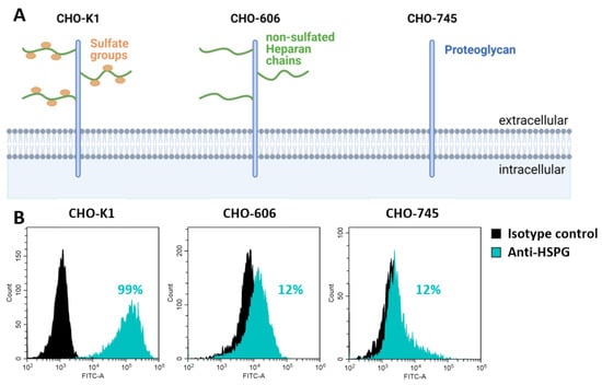 To prove the different HSPG depletions of the three used CHO cell lines, flow cytometric analysis was performed. In Figure 2A, the different HSPG-depletions of the CHO cell lines are displayed. CHO-K1 cells contain the wild type version of HSPG: a membrane-bound proteoglycan with protruding sulfated heparan chains [,]. The CHO-606 cells express non-sulfated heparan chains and CHO-745 retains the proteoglycan [,]. Cells were analyzed by flow cytometry and we found that 99% of CHO-K1 cells were positive for HSPG, and up to 12% sulfated heparan chains could be detected for the CHO-745 and -606 cells (Figure 2B, cyan).