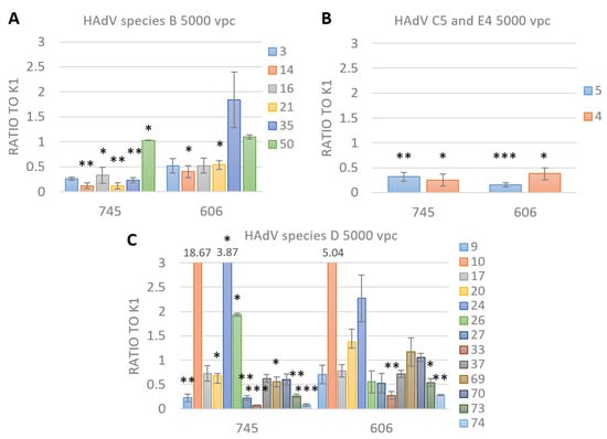 To determine the transduction efficiency of our GLN-encoding Ads, the three different CHO cell lines were infected with a range of 1000 to 10,000 vpc for each virus. At 24 hours post infection (hpi), luciferase assays were performed to compare the transduction rates of all used Ads among the HSPG-depleted CHO cells. The results displayed in Figure 3 show the transduction efficiency of CHO-745 and CHO-606 cells normalized to CHO-K1 cells for 5000 vpc and are subdivided into species B (Figure 3A), C, E (Figure 3B), and D derived Ads (Figure 3C). The results for the other vpc can be found in Supplementary Figure S1. In Table 2, the results of the GLN-Ad library screening are summarized by species and highest transduction efficiencies in the respective CHO cell lines. Additionally, the receptor and adapter usage of the different Ad species are displayed [,,].