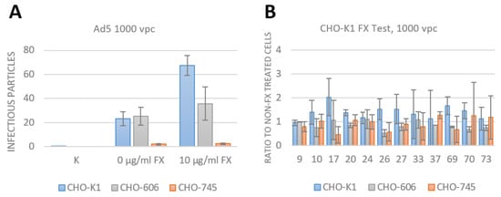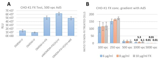 In addition, the effect of different FX concentrations was determined in a range from 6, 8 and 10 µg/mL (physiological level of FX in blood). For this purpose, CHO-K1 cells were infected with Ad5 ranging from 100 to 5000 vpc and 24 hpi, luciferase assays were performed. In Figure 4B, the results of this concentration gradient experiment are displayed. Data are shown as a ratio of treated to non-FX treated CHO-K1 cells. At 100 vpc of Ad5, the transduction efficiency is increased by FX up to 100-fold compared to non-FX treated cells and up to 160-fold for 250 vpc. Starting at 500 vpc, the effect of FX less pronounced (20-fold). However, at this dose we observed cytotoxic effects from added virus. As a conclusion, the physiological level of either 6, 8 or 10 µg/mL FX increased the transduction efficiency up to 160-fold compared to non-FX treated cells, but no significant difference can be observed when comparing only the different FX concentrations.