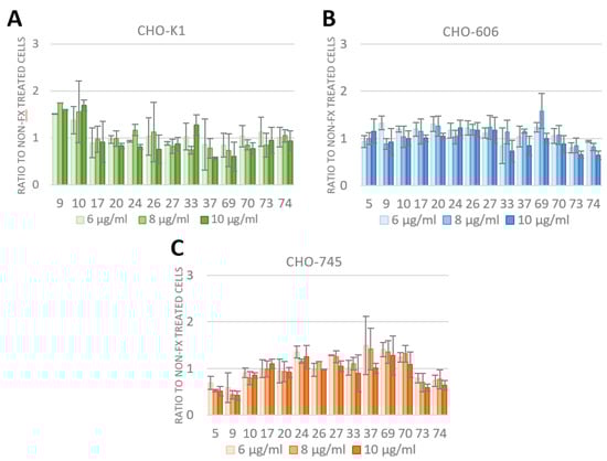The effect of FX on all species D Ads was tested in the HSPG-depleted CHO cell lines. The CHO cells were infected with 5000 vpc (according to the data from Figure 3) of 13 species D Ads together with 6, 8 and 10 µg/mL FX. At 24 hpi, luciferase assays were carried out. Ad5 was used as a control for CHO-606 and CHO-745 cells. The data for each HSPG-depleted CHO-cell line is shown in Figure 5A–C as a ratio to non-FX treated cells. In all used CHO cell lines, the transduction of the viruses was not enhanced by using any FX concentration as adapter to bridge the viruses to HSPG.