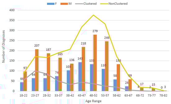 Distribution of individuals over clustered, non-clustered and sex by age group, genetic distance 3%. The bar graph demonstrates the frequency and age distribution of individuals in transmission clusters. The proportion of those in clusters (shown in gray) compared with those not in clusters (shown in yellow) is higher among younger individuals.