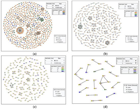 Using HIV-TRACE we identified 519 nodes linked to at least one other node at GD 3.0% (Figure 3a–d). A total of 189 clusters were formed, of which the largest had 33 nodes with 46 connected links at a mean genetic distance of 2.8% and 1.39 links per node. The second-largest dense cluster consisted of 15 nodes making 38 links with a higher transmission speed of 2.53 links per node. The male transmission clusters comprised 66% of identified networks and the female clusters were 10.5%. Recent infection based on the proportion of nucleotide ambiguity ≤0.5% identified a higher number of nodes from 2014 than from 2015. Networks spanning more than one jurisdiction were identified in 75 nodes comprising 14% of individuals identified to be in a transmission cluster.