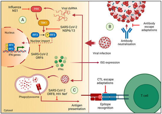 Summary of three sources of immune pressure during viral infection and viral proteins that act is immune modulators: (A) viral dsRNA is detected by immune sensing PRRs, triggering expression of IFN genes by phosphorylation and nuclear import of IRF-3. NS1 is a potent inhibitor of IRF-3 activation by binding viral dsRNA and preventing recognition by RIG-I. SARS-CoV-2 NSP6/13 are capable of binding TBK1 to suppress phosphorylation and activation of IRF-3, whereas ORF6 blocks its nuclear import factors; (B) neutralization of viral surface antigens by host antibodies, which is attenuated by adaptations in the surface antigen; (C) presentation of T cell epitopes by HLA class I molecules on the surface of the infected cell, which can be undermined by adaptations in HLA-restricted epitopes in a viral protein. (Created with BioRender.com).