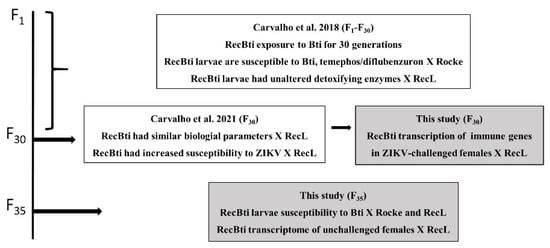 This investigation is part of a longitudinal study of the RecBti strain, which has been chronically exposed to Bti. Previous findings [,] and aspects investigated in the present study are summarized in Figure 1. In this study, the relative expression of seven immune genes in RecBti females from F30, which showed an increased ZIKV susceptibility in a previous study [], was compared with females from the RecL reference strain. Next, the susceptibility of F35 larvae to Bti was also assessed by comparing it with the Rockefeller reference strain, as part of the monitoring of this colony during its long-term exposure to Bti []. Finally, the whole transcriptome of F35 females unchallenged with ZIKV was compared with the RecL strain.