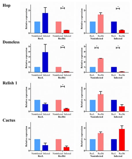 To investigate whether the higher ZIKV dissemination rate in RecBti-infected females from F30 revealed in a previous study [] was related to changes in the expression profile of the genes involved in arbovirus infection, seven targets were compared with a reference strain using pools of RNA extracted from the heads with attached salivary glands of those females. Those target genes were based on their involvement with the immune response to arbovirus previously reported in the literature (Table S1). First, the hop (AAEL012553) and domeless (AAEL012471) genes from the JAK-STAT pathway, which can stimulate the antiviral response, were investigated. In the comparison of infected and uninfected females analyzed within strains, both genes were significantly downregulated in RecBti, while they were upregulated in RecL (Figure 2). When infected females from the RecBti and RecL strains were compared, domeless and hop were significantly downregulated in RecBti (Figure 2). The Toll pathway markers relish 1 (AAEL007696) and cactus (AAEL000709) were also evaluated. The gene relish 1, a target that stimulates viral defense, was significantly downregulated after viral infection in both strains, compared with their respective non-infected counterparts. When the status of infected females from the strains was compared, the expression was reduced in the infected RecBti females, although this was not statistically significant (Figure 2). A negative modulator of the toll pathways, cactus, showed a reduction in the transcription level in infected individuals within both strains, although this was not significant. The analysis between strains showed an increase in expression in the infected RecBti females, but this was not statistically significant (Figure 2).