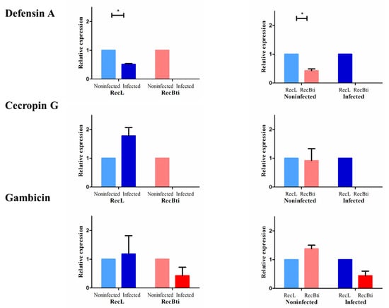 Relative expression of the genes coding antimicrobial peptides (defensin A, cecropin G, and gambicin) from Aedes aegypti females from a strain chronically exposed to Bacillus thuringiensis svar. israelensis (RecBti F30) compared with a reference strain (RecL). Comparison of pools (five female heads) from noninfected and infected samples within each strain (left) and between strains (right). Each column and bar represent the average and standard deviation of two assays. Each assay used two pools per condition and strain, in duplicate. Statistical differences of * p < 0.05, according to Student’s t-tests.