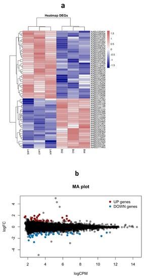 In this analysis, we sought to determine if exposure of the RecBti Ae. aegypti strain to Bti for 34 generations was related to a distinct gene expression profile in RecBti females (F35) that were not challenged with ZIKV. These females were compared with females from the reference strain (RecL), obtained under the same conditions, using a next-generation sequencing approach. For this purpose, F35 larvae were not treated with Bti and the respective females were not fed on blood. RNA samples obtained using pools of whole females from each strain, in triplicate, were subjected to transcriptome shotgun sequencing (RNA-seq). Analysis of the sequenced RNA-seq libraries showed a total of 10,103,560 and 13,058,581 reads obtained for the RecBti and RecL strains, respectively, and 87% and 85% of these genes were specifically mapped against the Ae. aegypti reference genome (Table S3), respectively. The MDS plot showed a consistent pattern among the replicates for each strain (RecBti: Bti2, Bti3, and Bti4; RecL: Lab3, Lab4, and Lab6), which allowed a comparative analysis (Figure S1). A heatmap of the DEGs generated by the replicates showed a global view of the differential expression observed between the RecBti and RecL strains (Figure 4a). Analysis by the EdgeR package was performed based on 9202 genes (Table S4), corresponding to around 46% of the total repertoire of genes, which showed at least one CPM in three samples and were also selected using the function filterByExpr from EdgeR.