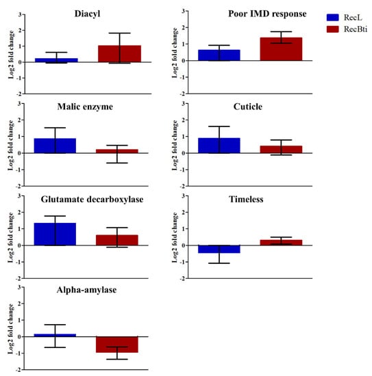 Relative expression of Aedes aegypti genes from the RecBti strain chronically exposed to the larvicide Bacillus thuringiensis svar. israelensis (RecBti F35) compared with the RecL reference strain. These were upregulated genes according to the RNA-seq analysis from Table 2. Columns represent average and standard deviation of three RNA samples analyzed in duplicate. Statistical differences of * p < 0.05 according to Student’s t-tests.