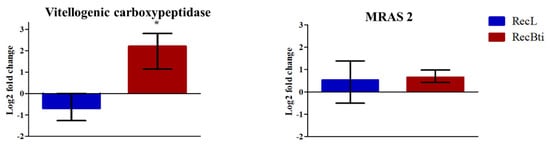 Quantitative reverse transcription polymerase chain reaction (RT-qPCR) assays were performed for two purposes: first, to evaluate the transcription of the seven selected genes related to the immune response described in Section 2.2; then, to validate the transcription status of some Differentially Expressed Genes (DEGs) revealed by the RNA-seq described in Section 2.6. The reactions were carried out using a one-step QuantiTect® SYBR Green RT-PCR® Kit (Qiagen, Hilden, Germany), following the manufacturer’s instructions and specific primers for each gene (Table S1). The ribosomal proteins rps17 and 18S were used as endogenous control genes for the assays of the genes involved in the arbovirus response and for selected DEGs shown by RNA-seq, respectively []. The samples were analyzed in a QuantStudio® 5 System (Thermo Fisher Scientific, Waltham, MA, USA) and the relative quantification was performed using Applied BiosystemsTM Analysis software, Relative Quantification Analysis Module v.3.3 [,]. For the immune genes, we first compared the gene expression within each strain fed with ZIKV-infected and uninfected blood using 2−ΔCtZIKV/2−ΔCBlood. Afterward, a comparison between strains fed with ZIKV-infected and uninfected blood was performed using 2−ΔCtRecBti/2−ΔCRecL. Then, the means and standard errors from two biological replicates of each strain (RecBti and RecL) and condition (ZIKV-infected and uninfected blood meals) were compared. For the validation of the DEGs, the means and standard errors from three biological replicates of each strain were analyzed. These analyses were carried out using Student’s t-tests in GraphPad Prism v.5.0.0 for Windows (GraphPad Software Inc., San Diego, CA, USA), considering a p-value < 0.05 to be statistically significant.