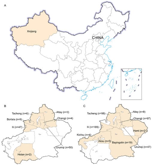 Xinjiang Uygur Autonomous Region (34°25′ N–48°10′ N, 73°40′ E–96°18′ E) is the largest province in China, comprising 14 prefectures with a total land area of 1,664,900 km2. Feral and farmed wild boars were hunted and/or sampled with the consent of the Xinjiang or Prefecture’s Forestry and Grassland Bureau and samples were processed according to the Law of The People’s Republic of China on the Protection of Wildlife. The age of feral wild boars was roughly estimated based on body weight, tusks, and neck mane, and the exact age of farmed wild boars was provided by the farmers. Blood, feces, and liver samples were collected after hunting and dissecting from feral wild boars. For farmed wild boars, blood samples were collected from the anterior vena cava, and feces were collected from the rectum. In total, we collected 599 serum, 599 fecal, and 89 liver samples from wild boars in 11 prefectures during 2017–2020, including 478 from farmed wild boars (farmed offspring of male wild boars and female domestic pigs preserving the appearance of wild boar) and 121 from feral wild boars. Of which, we collected the 121 feral wild boars (including 121 fecal, 121 serum, and 89 liver samples) in 7 prefectures during 2017–2020. Fecal, liver, and serum samples were collected from all feral wild boars, except that we failed to collect liver samples from 32 feral boars. In addition, we collected 478 fecal and 478 serum samples from all farmed live wild boars in 33 farms over 9 prefectures in 2019 (Figure 1, Table 1). Liver samples were not collected from farmed live wild boars. All samples were transported on dry ice and stored at −80 °C until testing. All serum samples were tested for anti-HEV antibodies, and all fecal and liver samples were tested for HEV RNA.