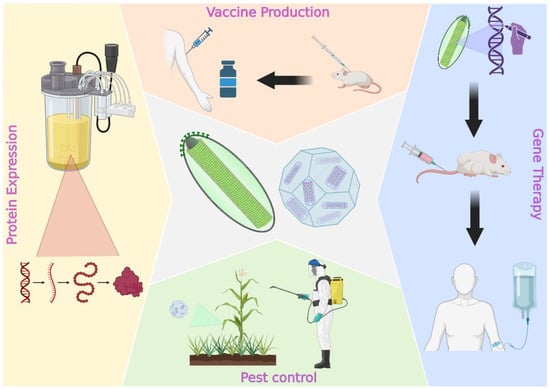 Schematic representation of main applications for baculovirus-based technologies. Created with BioRender.com, (accessed on 29 November 2022).
