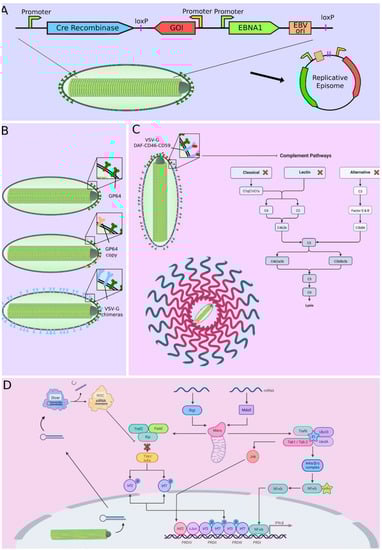 Improving transduction efficiency using vectors that produce replicative episomes (A), multiple copies of GP64 or VSV-G chimeras surface display (B), complement inhibitors surface display (C) and shRNA expression targeting antiviral response pathways (D). Adapted from “Detecting Viral Invaders” and “Complement Pathways”, by BioRender.com (accessed on 29 November 2022). Retrieved from https://app.biorender.com/biorender-templates.