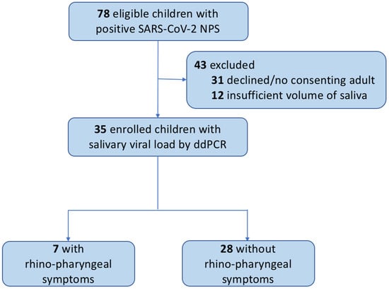 Of 78 eligible subjects testing positive for SARS-CoV-2 by RT-PCR of NPS samples, 12 were excluded due to insufficient saliva samples and 31 were excluded because consent was not obtained (Figure 1). Thus, SARS-CoV-2 SVL was determined by ddPCR in 35 children (Table 1).