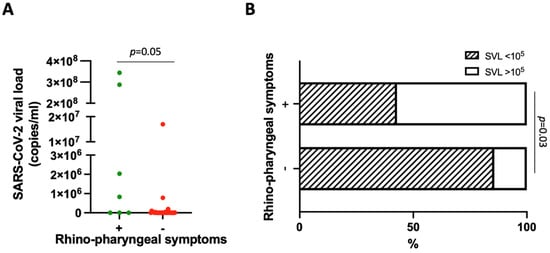 Next, we grouped patients based on their SVL values in subjects with more (“high SVL”) or less (“low SVL”) than 105 SARS-CoV2 copies/mL. This cut-off value was defined according to the mean SARS-CoV-2 viral load found in the saliva of a symptomatic/asymptomatic pediatric cohort []. SVL values were high in 57.1% of patients with rhinitis/pharyngodynia, 40% with cough, 33.3% with vomiting, 31.8% with fever, 28.6% with diarrhea/abdominal pain, and 16.7% with dyspnea, but 0% of asymptomatic patients or those with headache, exanthema, or conjunctivitis. High SVL values were significantly overrepresented in subjects with nasopharyngeal symptoms compared with those without these symptoms (4/7, 57.1%, vs. 4/28, 14.3%, OR = 8, CI 95% 1.28–50.03, p = 0.03) (Figure 2B).