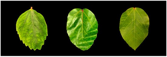 Symptomatic hibiscus leaves (left and middle) and a healthy leaf (right) were collected on the island of Oahu, Hawaii.