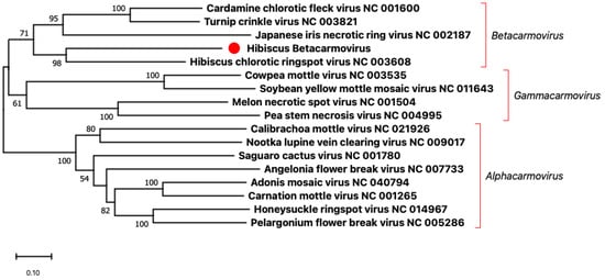 Phylogenetic analysis based on the genomic nucleotide sequences of members of the genera Alphacarmovirus, Betacarmovirus, and Gammacarmovirus was performed using the Maximum Likelihood method and MEGA X software with 1000 bootstrap repetitions. The red dot indicates the new virus hibiscus betacarmovirus that we found in this study.