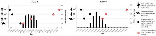 On 3 August, the index patient (B1) on Farm B, which houses a herd of approximately 8000 mink, developed symptoms consistent with COVID-19. B1 reported working on the farm daily for the four days prior to and the day of symptom onset, and then did not return to working on the farm until after symptoms resolved on 9 August. On 4 August, mink in the herd were noted by another farm worker (B2) to have inappetence and respiratory signs. On 6 August, B2, who is also a household contact of the index patient on this farm, developed respiratory symptoms and profound fatigue. On the same day, increased mortality began in the herd, beginning with deaths of 10 adult female mink; the baseline expected level of mortality on Farm B was reported to be one to two mink losses per day. Over the next 8 days, the losses increased to hundreds of mink per day, peaking on 9 August, and declining until returning to baseline by 14 August. In total, Farm B lost 1251 (~15.2%) mink by the end of August (
