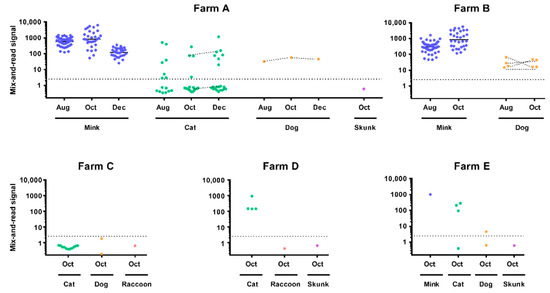 Serological testing was conducted on a total of 212 mink, 15 dog, 72 cat, 2 raccoon, and 3 skunk serum specimens across five farms (Farms A, B, C, D, and E) during the field investigations in August, October, and December 2020 (