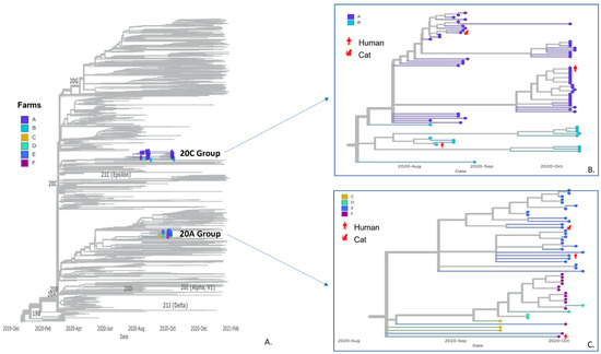 Table S1). These sequences were included in a phylogenetic analysis alongside 2250 selected Utah human sequences, including 407 community sequences from the same counties as the farms. All 113 sequences fell in the B.1 PANGO lineages where sequences from Farms A and B formed a monophyletic group within clade 20C, while sequences from Farms C–F formed a monophyletic group in clade 20A (