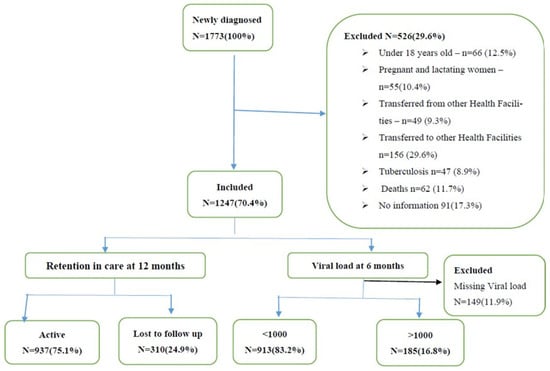 Flowchart of identification and selection of study patients, as well as their characterization in relation to retention at 12 months and viral load at 6 months.