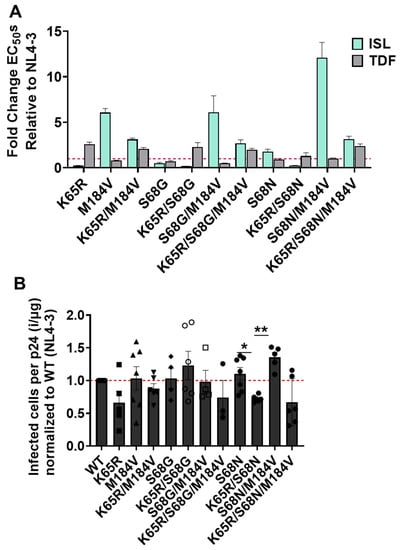 To evaluate the contributions of the individual mutations and combinations of mutations—identified during viral passaging experiments, we introduced mutations into the HIV-1 NL4-3 lab strain and determined sensitivity to ISL and TDF (Figure 1A). M184V conferred 7-fold resistance to ISL and was 2-fold more sensitive to TDF than WT, consistent with previous reports [,,,,]. K65R was found to be hypersensitive to ISL (4-fold more sensitive than WT) and 3-fold resistant to TDF, which was also consistent with previous findings [,,,,,,,]. The K65R/M184V double mutant was more sensitive to ISL that M184V alone (3-fold resistance relative to wildtype compared to 7-fold for M184V), and more sensitive to TDF than K65R alone (2-fold resistance relative to wildtype compared to 3-fold for K65R), but the double mutant also lacked the hypersensitivities of the single mutants. In that respect, viruses containing K65R/M184V may be advantageous for the viruses that are passaged under selection of both ISL and TDF. The additional mutants, S68G/M184V and S68N/M184V, had 6-fold and 12-fold resistance to ISL, respectively, while both were found to be susceptible to TDF (Figure 1A). No major resistance to ISL (>12-fold resistance) or TDF (>4-fold resistance) was observed.