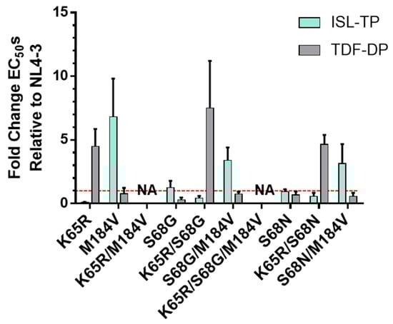 Potency of ISL and TFV against resistant mutants in vitro. Viral particles were produced by transfection of mutant infectious clones into 293T cells. Virions were harvested and samples normalized by ELISA. RT activity was measured by endogenous RT assay in the presence or absence of antivirals. Dose-response curves were produced for each mutant and the IC50s calculated. Mutants were normalized to WT infection to produce the fold change. Dashed line denotes NL4-3. The results represent the means and SD for two or three independent experiments performed in duplicate. NA, these values could not be calculated from the experimental data.