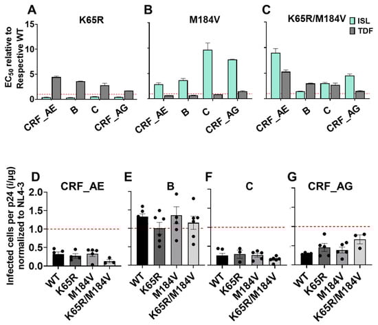 Unlike the other subtypes, isolate CRF_AE K65R/M184V had greater resistance (9-fold) to ISL than M184V (3-fold). This was unexpected as K65R/M184V double mutants displayed an intermediate phenotype in all other isolates examined, presumably as a consequence of the enhanced resistance conferred by M184V and the enhanced sensitivity of K65R (Figure 4C). B, C, and CRF_AG containing K65R/M184V had 1.4-, 3-, and 4.5-fold resistance to ISL, respectively (Figure 4C). In addition, CRF_AE K65R/M184V had 5.2-fold resistance to TDF, greater than that observed for B, C, and CRF_AG K65R/M184V, which had 3-, 2.7-, and 1.5-fold resistance to TDF, respectively. To understand whether these mutations impact the specific infectivity of the isolates, we performed single-round replication viral fitness studies. In CRF_AE, C, and CRF_AG isolates, all mutants had reduced specific infectivity relative to NL4-3 but the mutants had no significant change in specific infectivity compared to their respective WT (Figure 4D,F,G). The subtype B isolate had similar specific infectivity to NL4-3 and the mutants K65R, M184V, and K65R/M184V also had no effect on specific infectivity (Figure 4E).