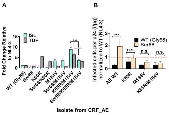 3.5. Polymorphism of Gly68 in CRF_AE K65R/M184V Influences Susceptibility to ISL and TFV and Viral Fitness