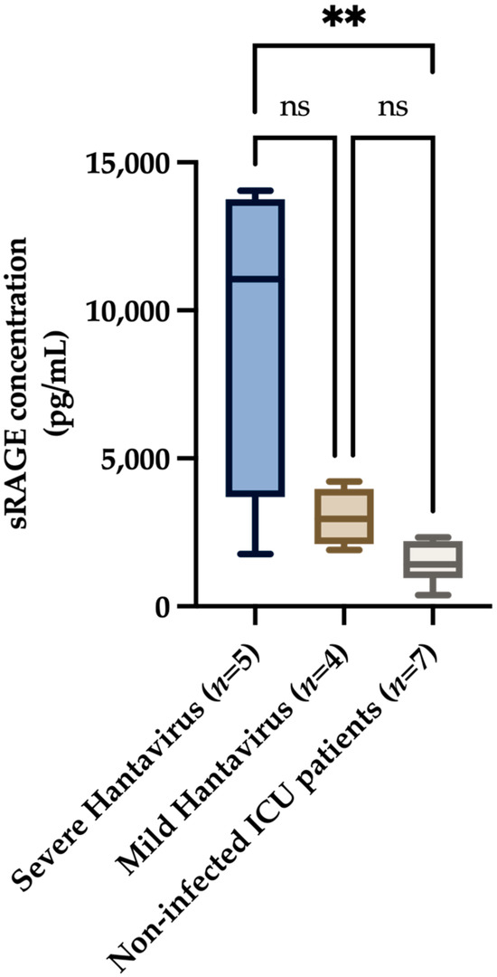 Plasma sRAGE concentration in the severe hantavirus group, the mild hantavirus group, and non-infected ICU patients. The data are presented as a graphical representation of the comparison between the groups. For plasma sRAGE level comparisons across different groups, Kruskall–Wallis was utilized. Dunn’s multiple comparisons test was conducted for post hoc analysis. A p-value of < 0.05 was considered statistically significant. ** = p value < 0.01; ns—non-significant.