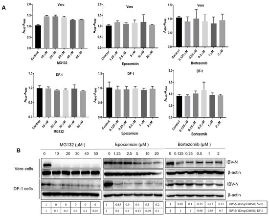 IBV infection is suppressed by treatment with proteasome inhibitors. (A) Vero cells and DF-1 cells were incubated with increasing concentrations of MG132 (0–50 μM), Epoxomicin (0–20 μM), or Bortezomib (0–2 μM) for 12 h and subjected to a cell viability assay using the WST-1 assay kit. The untreated cells were included as a control group. In total 450 nm is the determination wavelength, and 690 nm is the reference wavelength. The value of each sample was normalized to the control group and presented in a bar graph panel. Error bars represent the standard deviations from three replicates. (B) Vero and DF-1 cells were infected with 1 MOI of IBV for 1 h and incubated with increasing concentrations of MG132 (0–50 μM), Epoxomicin (0–20 μM), or Bortezomib (0–2 μM). To determine the virus infectivity, the expression of the IBV N protein was analyzed by western blot at 12 h.p.i. β-actin was measured as an internal loading control. The intensity of the IBV-N band was determined with image J, normalized to β-actin, and shown as a fold change of Drug:DMSO.