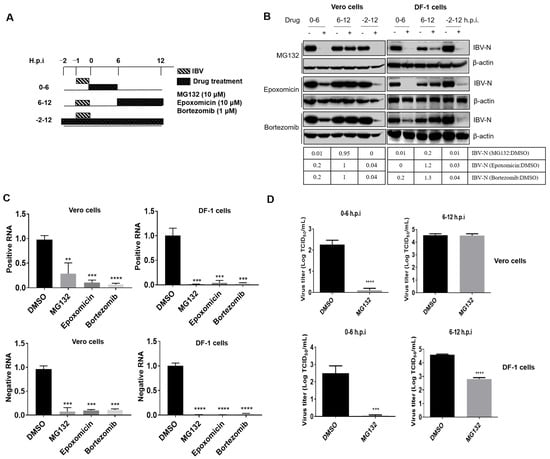 Proteasome inhibitors act in the early stages of IBV infection. (A) Experimental design for pulse treatment with different proteasome inhibitors. The cells were treated with inhibitors during different infection times and collected at 12 h.p.i. (B) Vero and DF-1 cells were infected with 1 MOI of IBV and incubated with MG132 (10 μM), Epoxomicin (10 μM), and Bortezomib (1 μM) at 0–6 h.p.i., 6–12 h.p.i., or −2–12 h.p.i. The cells were collected at 12 h.p.i., and IBV N protein was detected by western blot. β-actin was measured as an internal loading control. The intensity of the IBV-N band was determined with image J, normalized to β-actin, and shown as a fold change of MG132:DMSO, Epoxomicin:DMSO, and Bortezomib:DMSO. (C) Vero and DF-1 cells were infected with 1 MOI of IBV and incubated with MG132 (10 μM), Epoxomicin (10 μM), and Bortezomib (1 μM) at 0–6 h.p.i. The cells were collected at 12 h.p.i. for detection of positive and negative sense viral RNA levels by using RT-qPCR. (D) Vero and DF-1 cells were infected with 1 MOI of IBV and incubated with MG132 (10 μM) at 0–6 or 6–12 h.p.i. The culture medium was collected at 12 h.p.i. for detection of virus yield by using TCID50. The experiments in C and D were performed in triplicate, and the average values with stand errors were calculated and presented in a bar graph panel. The asterisk (*) represents the p-value of the statistical test. ** p-value < 0.05 (significant); *** p-value < 0.01 (very significant); **** p-value < 0.001 (highly significant).