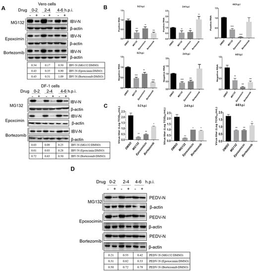 The active proteasome is required for IBV invasion at 0–4 h.p.i. (A) Vero or DF-1 cells were infected with 1 MOI of IBV and incubated with proteasome inhibitors at 0–2 h.p.i., 2–4 h.p.i., and 4–6 h.p.i. Cells were collected at 8 h p.i. to detect IBV N protein by using western blot. (B) Vero cells were infected with 1 MOI of IBV and incubated with proteasome inhibitors at 0–2 h.p.i., 2–4 h.p.i., and 4–6 h.p.i. Cells were collected at 8 h.p.i. for detection of positive and negative sense viral RNA levels by using RT-qPCR. (C) The cell culture medium in (B) was collected at 8 h.p.i. for detection of virus yield by using TCID50. The experiments in B and C were performed in triplicate, and the average values with stand errors were calculated and presented in a bar graph panel. (D) Vero were infected with 1 MOI of PEDV and incubated with proteasome inhibitors at 0–2 h.p.i., 2–4 h.p.i., and 4–6 h.p.i. Cells were collected at 8 h p.i. to detect the expression of PEDV N protein by western blot. The intensity of the IBV-N or PEDV-N band was determined with image J, normalized to β-actin, and shown as a fold change of MG132:DMSO, Epoxomicin:DMSO, and Bortezomib:DMSO. The asterisk (*) represents the p-value of the statistical test. * p-value < 0.1; ** p-value < 0.05 (significant); *** p-value < 0.01 (very significant); **** p-value < 0.001 (highly significant).