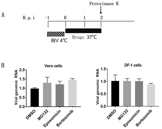 Next, we attempted to dissect which virus invasion step UPR participates in [43,51]. Firstly, we examined whether proteasome inhibitors suppress IBV internalization. Vero cells and DF-1 cells were incubated with IBV at 4 °C for 1 h to allow viruses to attach and bind to the cell surface, then the medium was removed and replaced with fresh culture medium and incubated at 37 °C for 2 h, allowing virus endocytosis and internalization in the absence or presence of inhibitors [52]. After that, the cells were treated with proteinase K to remove the cell surface virus, and cells were harvested for measurement of internalized viral genomic RNA by RT-qPCR. As shown in Figure 4B, compared with the DMSO-treated group, proteasome inhibitors exerted no effect on the level of the incoming virus genome, suggesting that an active proteasome is not needed for IBV internalization.