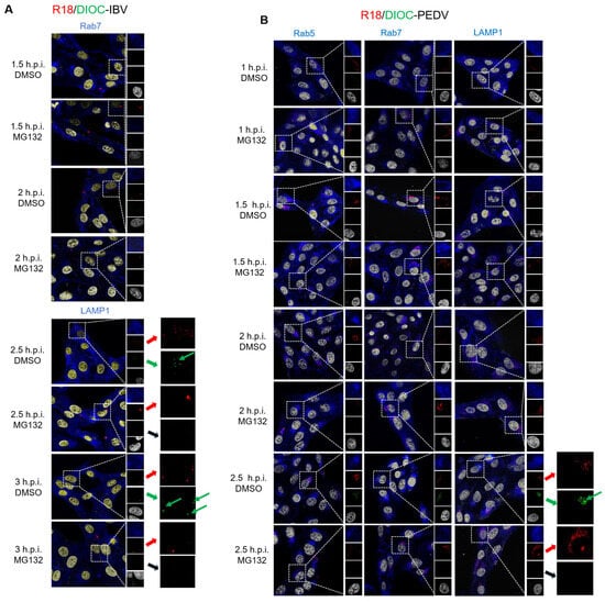 Proteasome inhibitors interfere with IBV and PEDV membrane fusion with late endosomes or lysosomes. (A,B) Vero cells were infected with 5 MOI of R18/DiOC-labeled IBV or R18/DiOC-labeled PEDV in the presence of DMSO or MG132. Cells were subjected to immunofluorescence with anti-Rab5, anti-Rab7, or anti-LAMP1 antibodies at the indicated time points. The separation of R18 (red) and DiOC (green) signals and the late endosomal or lysosomal marker (blue) were observed under an LSM880 confocal laser-scanning microscope. Representative images were shown. Red signals and red arrows represent the R18-labeled virus; green signals and green arrows represent the membrane fusion released by DiOC; blue signals represent early endosomes (Rab5), later endosomes (Rab7), and lysosomes (LAMP1).