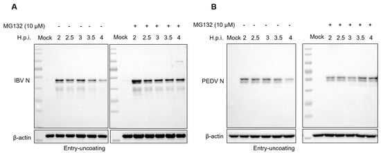 After membrane fusion, the coronavirus nucleocapsid is released into the cytosol by uncoating, and the RNA genome then serves as a template for polyprotein 1a and 1ab translation. As UPS is required for membrane fusion, we speculate that the inhibition of UPS will affect the following: uncoating and genomic RNA release. It has been reported that SARS-CoV-2 and PEDV N proteins are ubiquitinated and degraded in cells [79,80]. Whether the incoming N protein within the virion is degraded and involved in the release of genomic RNA is unclear. Here, we infected Vero cells with 10 MOI of IBV or PEDV, respectively, in the presence of 10 μM MG132 or an equal volume of DMSO, and harvested the cells at 2, 2.5, 3, 3.5, and 4 h.p.i. Western blot results in Figure 6A,B showed that along with the infection time course (2–4 h.p.i.), the incoming IBV N and PEDV N protein signal decreased, especially at 3.5 h.p.i. and 4 h.p.i., suggesting both IBV and PEDV N proteins are degraded after membrane fusion. The MG132 treatment recovered the N protein level, indicating the prevention of the degradation of N protein.
