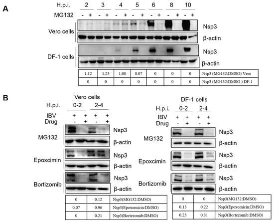 Proteasome inhibitors interfere with IBV initial translation. (A) Vero and DF-1 cells were infected with 1 MOI of IBV, treated with MG132 or DMSO, and subjected to Western blot for detection of the expression of the initial translation product nsp3 at 2, 3, 4, 5, 6, 8, and 10 h.p.i. (B) Vero and DF-1 cells were infected with 1 MOI of IBV and treated with proteasome inhibitors at 0–2 and 2–4 h.p.i. Cells were harvested at 5 h p.i. and subjected to western blotting for detection of the expression of nsp3. The intensity of IBV nsp3 was determined with image J, normalized to β-actin, and shown as a fold change of MG132:DMSO, Epoxomicin:DMSO, and Bortezomib:DMSO.