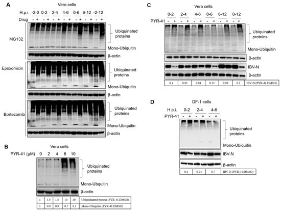 We next treated cells with PYR-41, a ubiquitin-activating enzyme E1 inhibitor, to suppress the ubiquitination process of cellular proteins [83]. Firstly, we determined the working concentration of PYR-41. Results showed that 8–10 μM PYR-41 led to the accumulation of ubiquitinated cellular proteins and decreased the free ubiquitin monomer (Figure 8B). Vero cells were then infected with IBV and treated with 10 μM PYR-41 at 0–2, 2–4, 4–6, 0–6, 6–12, and −2–12 h.p.i., and subjected to western blot at 12 h.p.i. Again, we observed the accumulation of ubiquitinated proteins and the depletion of ubiquitin monomers by PYR-41 treatment. It has been reported that in the presence of PYR-41, the ubiquitin monomer is in inactivated status, and downstream ubiquitination and ubiquitination-dependent protein degradation or other ubiquitination-mediated cellular activities are blocked [83]. Interestingly, in this study, we observed that the ubiquitinated proteins also accumulated in the presence of PYR-41, similar to proteasome inhibitor treatment. Inhibition of the ubiquitination process by PYR-41 at 0–2, 0–6, and 0–12 h.p.i. greatly decreased the infection by IBV, while inhibition of the ubiquitination process 2–4, 4–6, and 6–12 h.p.i. displayed less suppression on IBV infection (Figure 8C). Thus, PYR-41 mainly interferes with IBV infection at 0–2 h.p.i. In DF-1 cells, similar results were observed (Figure 8D). The above evidence demonstrates that the ubiquitination state of proteins in general also plays an important role during the IBV entry step.
