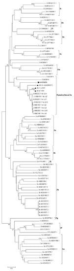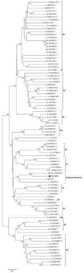 2.3. Full-Length Genome Sequencing by Next Generation Sequencing (NGS), Sequence Analysis and Phylogenetic Reconstruction