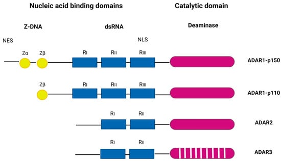 The ADAR protein family. ADAR1, interferon-inducible p150 and constitutively expressed p110 form, ADAR2, and ADAR3. ADAR1 and ADAR2 have deaminase activity. ADAR3 lacks deaminase activity and has a role in regulation of editing. Z-DNA binding domains (Zα and Zβ) are shown as yellow circles, the dsRNA binding domains (RI, RII, and RIII) are shown as blue rectangles, and deaminase catalytic domains are shown are purple ovals. A stripped purple oval indicated a lack of deaminase activity. Figure adapted from [] and generated in BioRender.com (Available online: https://www.biorender.com/, accessed on 10 September 2023).