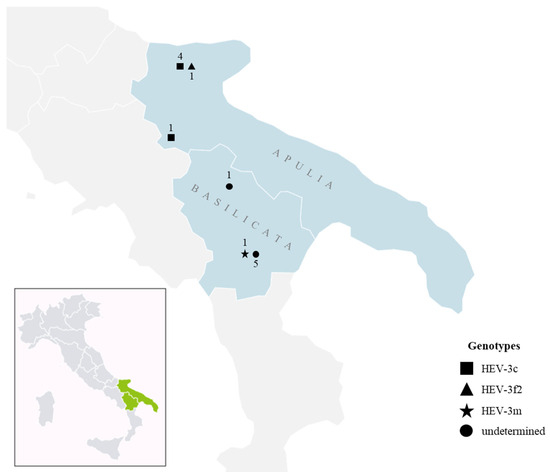 Figure 1 displays the geographic distribution in Apulia and Basilicata regions of the HEV positive samples characterized at the genotype and subtype level.