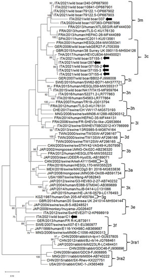 Epidemiological studies in Italy have shown that subtype 3f is the most common subtype detected in humans and animals, followed by subtype 3c [57,58]. The same scenario has been reported in humans in other European countries [51,59]. Interestingly, after 2010, in some European countries, a shift in subtypes was observed among HEV-3 human strains, and the subtype HEV-3c became predominant in France, England, Wales, The Netherlands, Germany, and since 2016, in Belgium [51,59,60,61]. In Italy, this shift was not observed. Certainly, HEV-3f was the first ever detected subtype (the year 1985) in Italy among swine and wild boar, whilst subtype 3c was identified from 2006 onwards [57]. The shift in HEV-3 subtypes in Europe could be attributed to the trading of pigs in European countries. The subtype HEV-3c might have been introduced to Italy with the trading of meat or live animals from Central European countries [57,58].