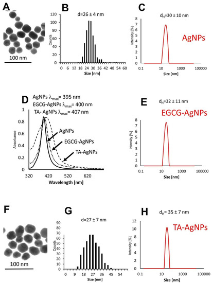 The characterization of AgNPs, EGCG-AgNPs, TA-AgNPs was performed using Dynamic Light Scattering (DLS, Litesizer 500, Particle Analyzer, Anton Paar, Graz, Austria), High-Resolution Scanning Electron Microscopy equipped with transmission detector STEM II (HR-STEM, NovaNanoSEM 450, FEI, Hillsboro, OR, USA) and UV-vis spectroscopy (HL-2000, Ocean Optics, Ostfildern, Germany). Samples for HR-STEM were prepared by drop-casting an aqueous dispersion of the nanoparticles onto carbon-coated copper grids and measurements of at least 500 nanoparticles.