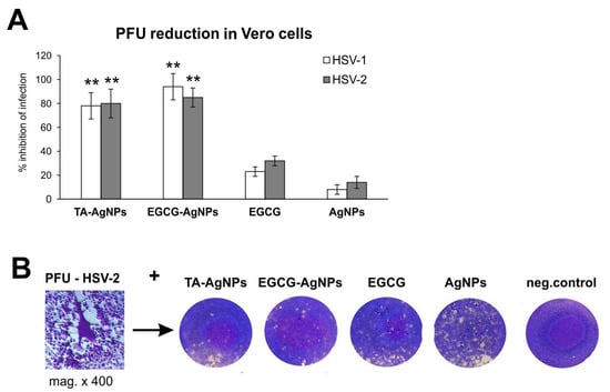 Figure 3). This tendency was observed for both HSV-1 and HSV-2, which indicates that this difference is probably cell-type related and depends on heparan sulphate structure and other cellular receptors present on these two cell types. Nevertheless, EGCG-AgNPs are much more effective as antivirals, probably due to the mechanism of binding with the virion’s surface.